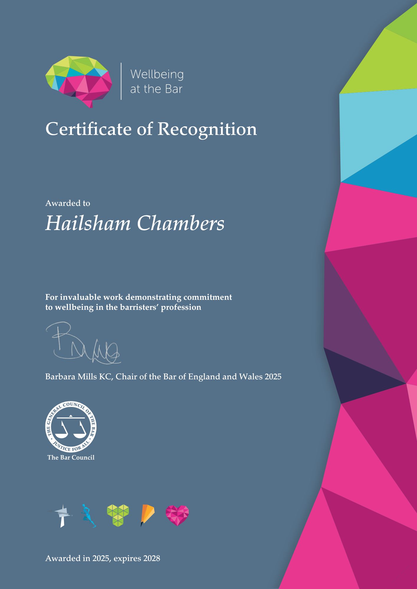 We’re delighted to announce that the Bar Council of England and Wales has awarded Hailsham Chambers a Wellbeing Certificate of Recognition!